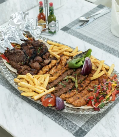 Mixed Charcoal Grill of (Lamb and Chicken kebab, Shish Taouk, Awsal lahm, and Lamb Chops, Served with kabsa Rice or