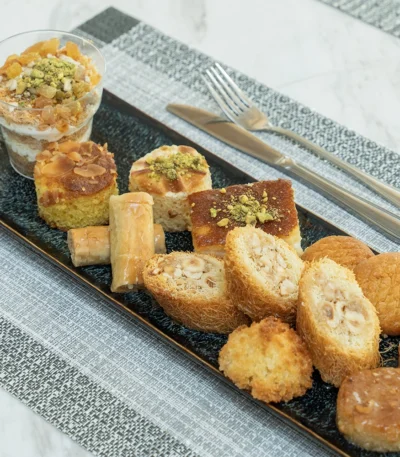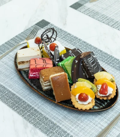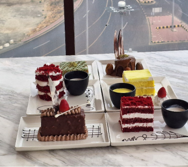 Cheese Cake, Saffron cheese cake, Honey cake, Chocolate brownies, chocolate lava cake, louts’ cake, Millefeuille, Apple Tart, Red Velvet Cake,