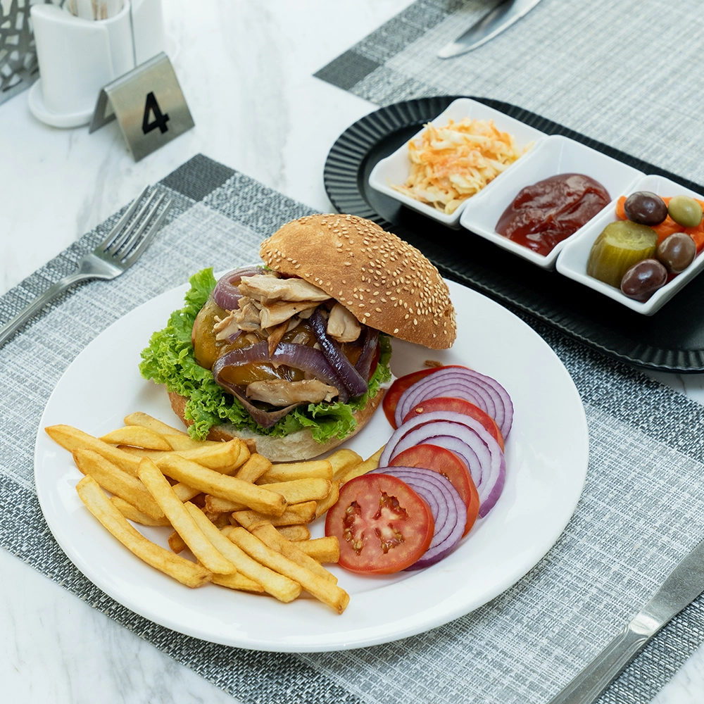 Burger bun, Minced beef, Emmental cheese caramelized onion Served with French Fries Coleslaw and Arabic pickled
