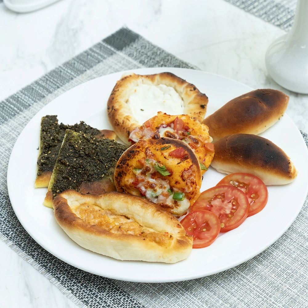 Levantine Bread Topped with Zaatar, Cheese and labneh and minced Lamb