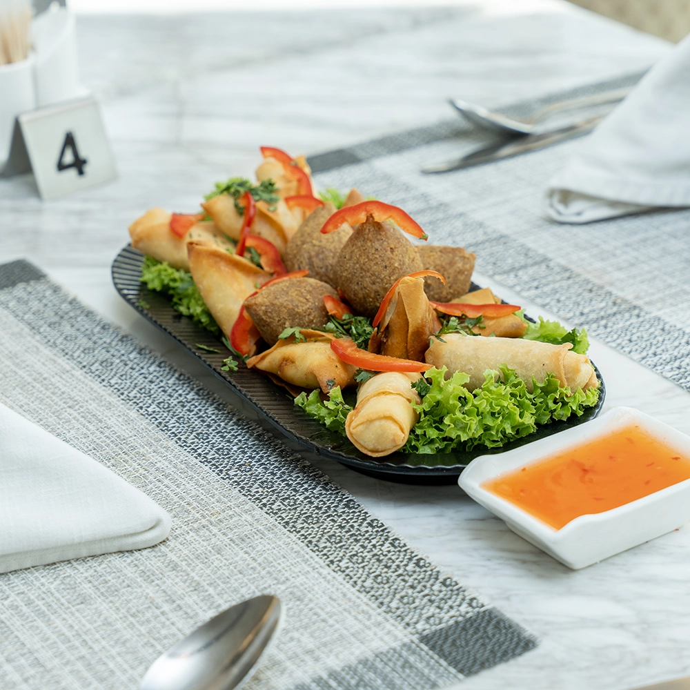 Kabbah, Mix Sambousek, Spring roll, Served with Arabic bread
