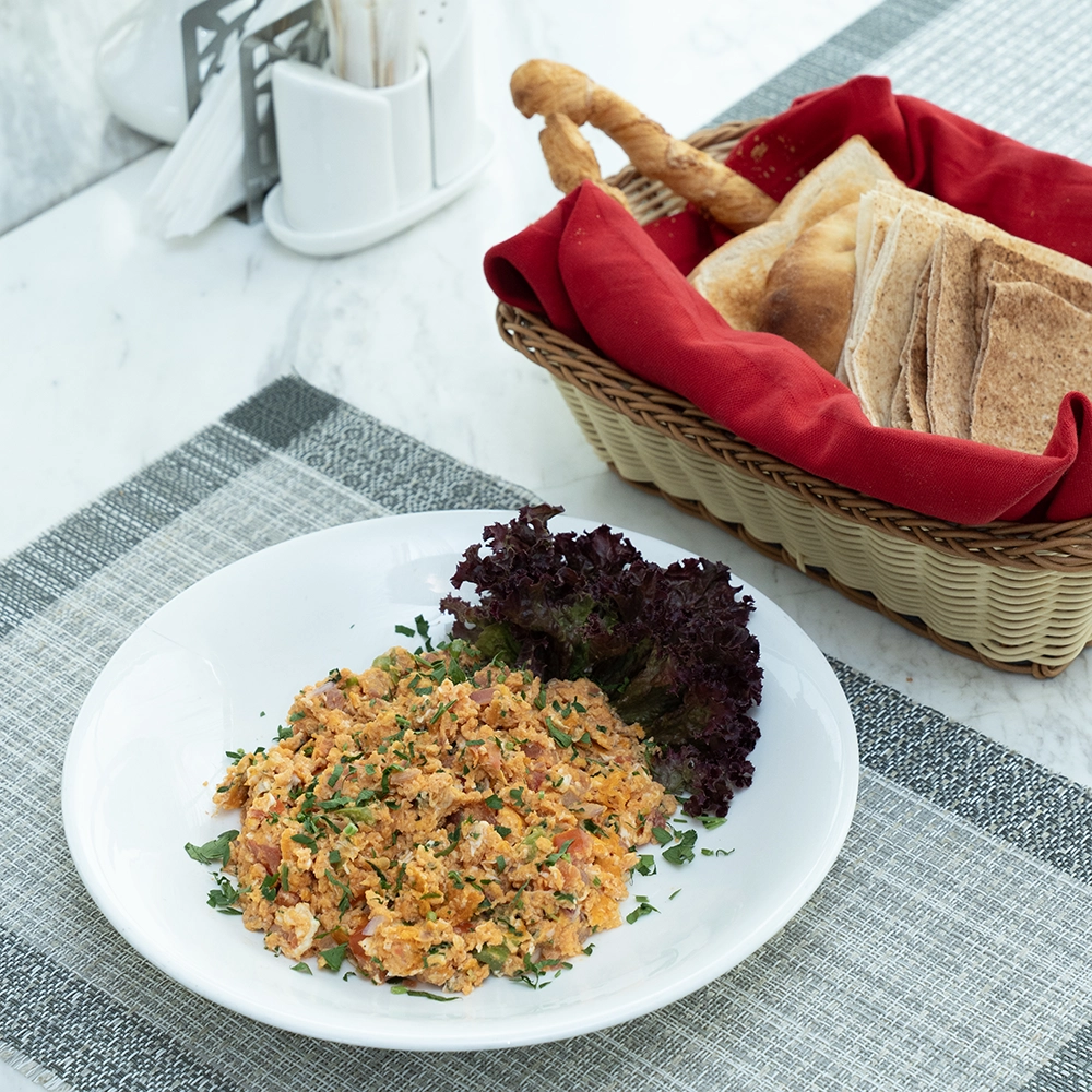 Three scrambled Eggs with Tomato, Onion and fresh Parsley