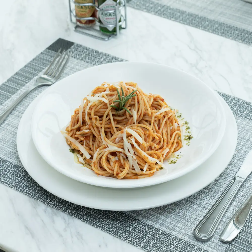 Spaghetti pasta with Homemade Tomato sauce Served With parmesan cheese